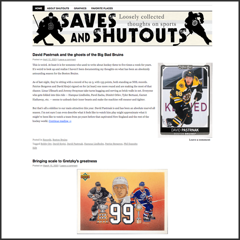 Loose, essay style writing on sports, with an occasional graphic or some other trivial nonsense. The focus shifted exclusively to baseball from about 2012-17, but has since shifted back to sports in general (primarily, hockey). I've also created all the graphic elements on the blog, including banners and manipulating the Wordpress template.